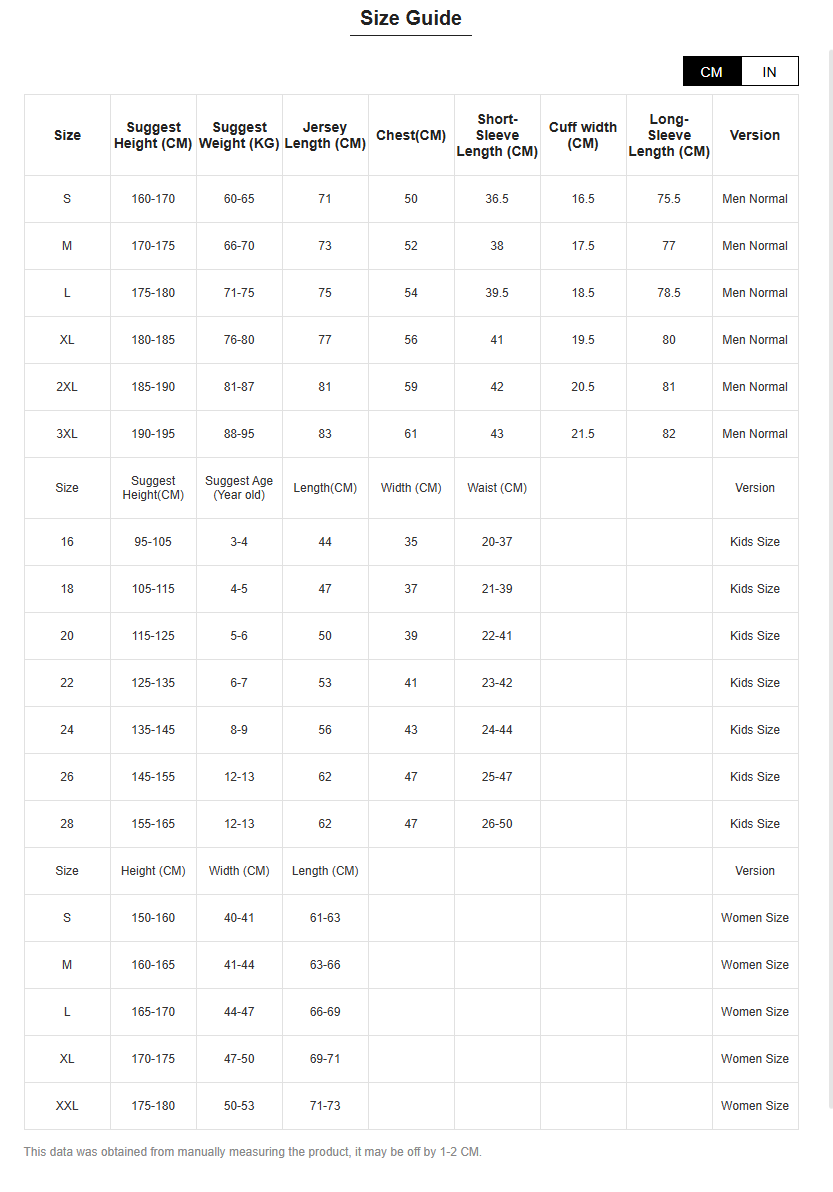 | Size | Length (CM) | Chest (CM) | Height (CM) | Weight (KG) |